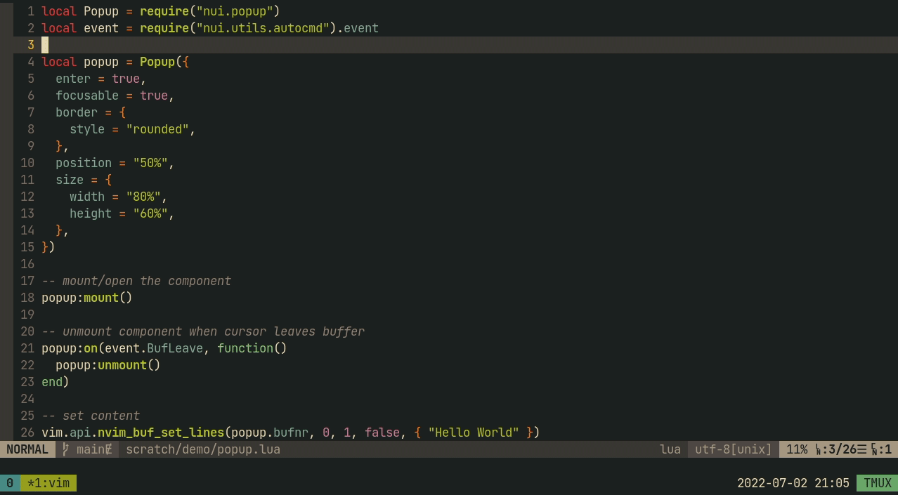 vim.api.nvim_buf_set_lines(popup.bufnr, 0, 1, false, { "Hello World" })