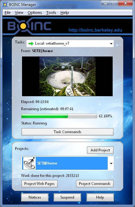 In the Projects window, when you click on the Add Project button, the Add project or Account Manager wizard pops up, allowing you to add a new project or attach BOINC to an account manager. When you click on the Tasks drop-down button, you can select whichever project you like, and then use the Project Web Pages button to navigate to the project, while the Project Commands button allows you to give specific commands to BOINC.