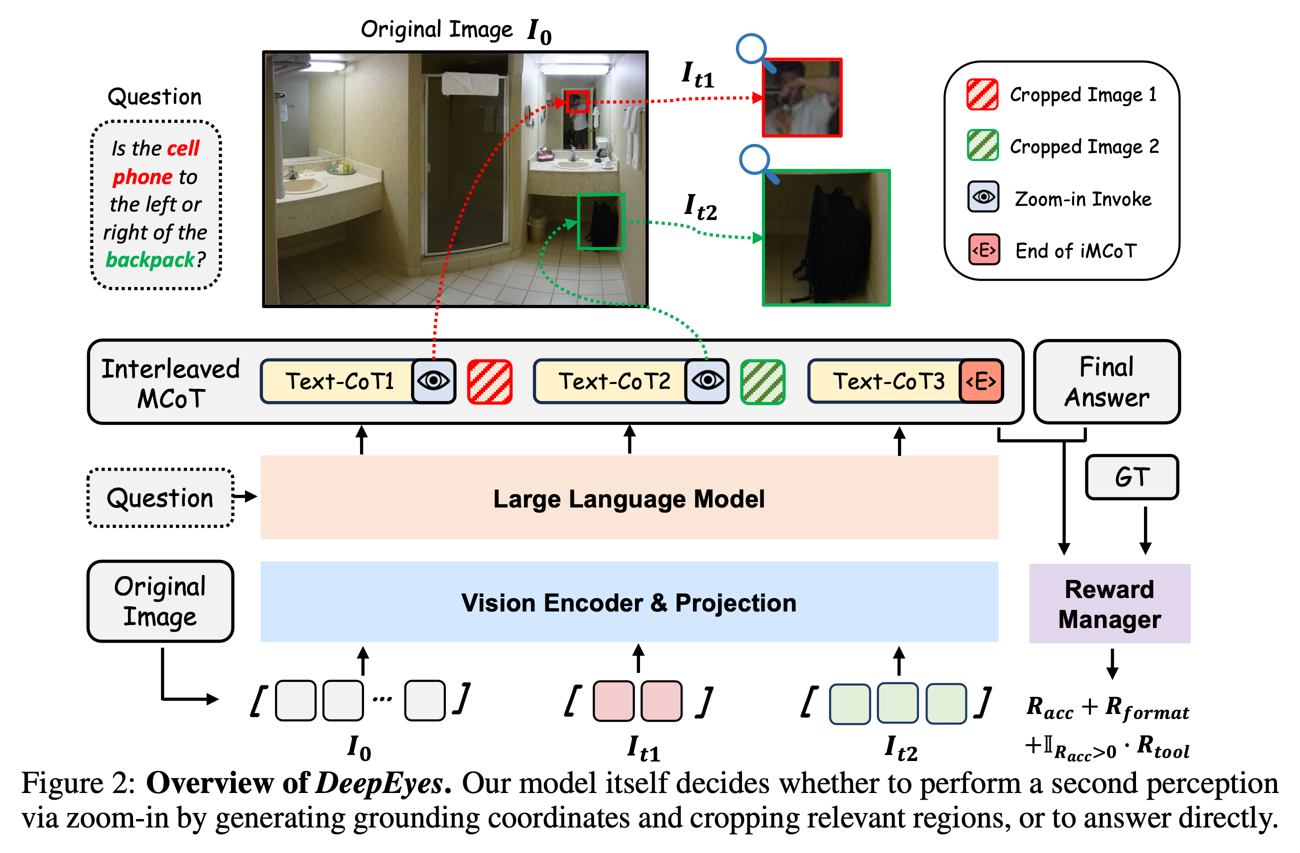 - The capability of DeepEyes to think with images is learned via end-to-end reinforcement learning. It is directly guided by outcome reward signals, requires no cold-start or supervised fine-tuning, and does not rely on specialized external model.