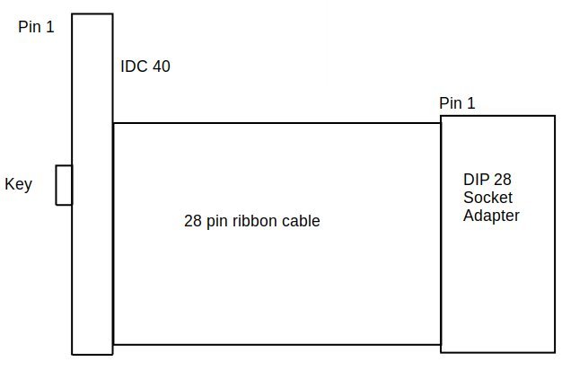 Via ribbon cable with DIP-28 adapter. Uses 40 pin IDC connector, but only 28 pins are used. Target power state detection is supported (external bus is resistant to the target high-z bus state).