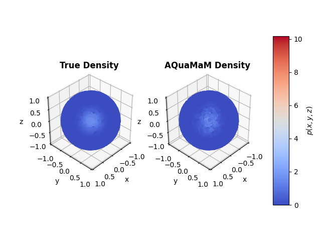 python3 evaluate.py ${MODEL} ${DATASET}Following "Delving into Discrete Normalizing Flows on SO(3) Manifold for Probabilistic Rotation Modeling", I trained AQuaMaM on a "peak" distribution (Colab notebook here). On this distribution, the discrete normalizing flow model reached a log-likelihood of 13.93 with the next closest baseline model reaching 13.47 (see Table 1 in their paper). In comparison, AQuaMaM reached a log-likelihood of 29.51. This performance is a direct consequence of AQuaMaM's formulation, and is discussed in Section 2.4 of the manuscript: