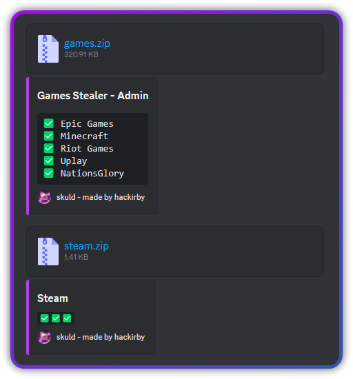 - tokens: Extracts tokens from 4 Discord applications, Chromium-based browsers, and Gecko browsers.