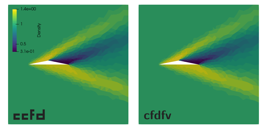 ccfd is a two-dimensional finite volume solver for the Euler- or Navier-Stokes-equation systems on structured or unstructured grids. It can perform 1st or 2nd order spacial and temporal discretization, with explicit Euler or Runge-Kutta integration, or implicit Krylov subspace iteration. The code runs on multiple threads using OpenMP parallel for loops, if compiled with -fopenmp.