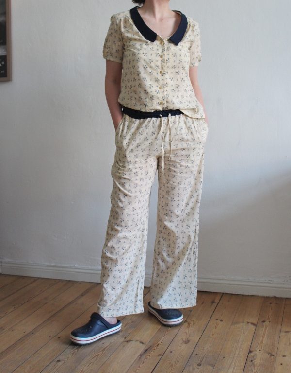 So optisch erinnert der Pyjama an Bilder von den Vintage Beach Pyjama. Und gerade durch die dunklen Akzente schaut das Set nicht nur nach Schlafanzug aus. Besonders das Oberteil könnte vermutlich auch einfach als Bluse getragen werden. Obwohl ich es sehr schräg finde im Pyjama vor die Tür zu treten, auch wenn der nicht nach Pyjama aussieht und es niemand weiß.