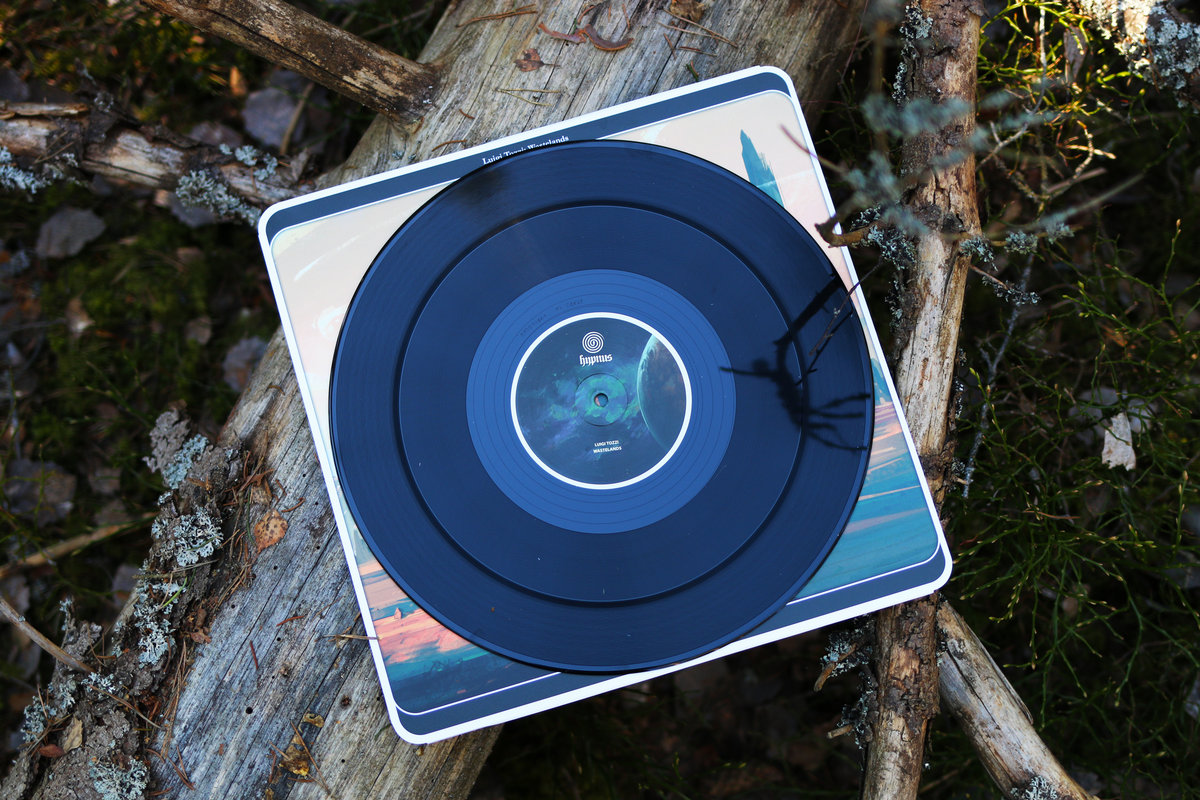 A black 180-gram vinyl record sheathed in a natural paper sleeve.
