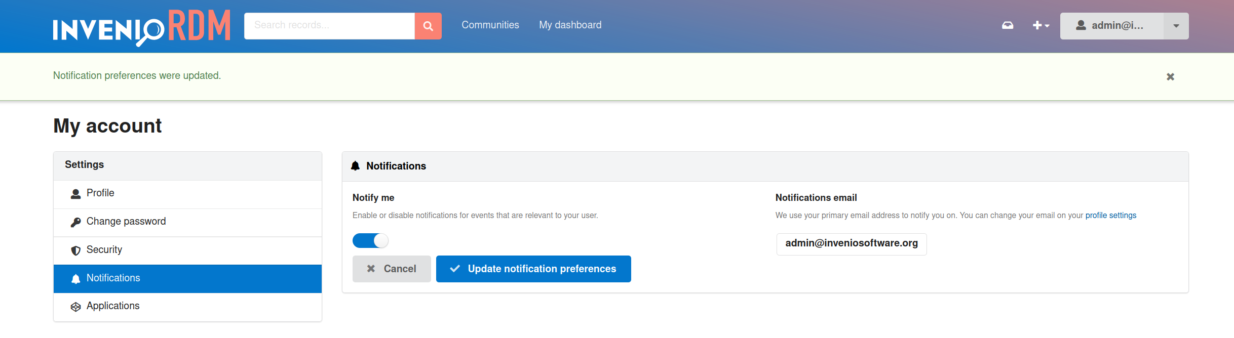 Notifications are sent following specific events (e.g. community invitation, community record submission), to inform users of relevant actions. Institutions can define their own available ways of sending notifications. InvenioRDM uses email notifications by default.