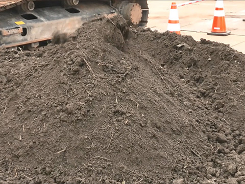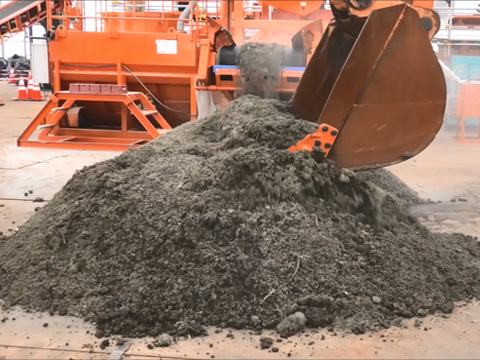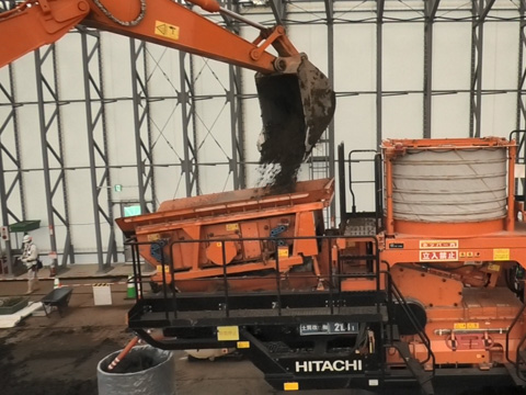 復興再生利用の用途に合わせた放射能濃度で選別した土壌の水分、粒度などを改質材を使って調整します。