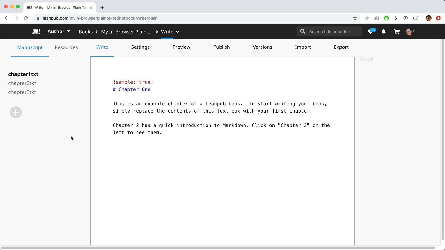 On this page, you will see lots of helpful information that we recommend you read at some point. However, for this tutorial, let’s just dive in to the In-Browser Plain Text editor, where you will spend your time writing your book!