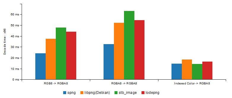 The test suite consists of over 1000 test cases, 175 test images are decoded with all possible output format and flag combinations and compared against libpng for correctness.