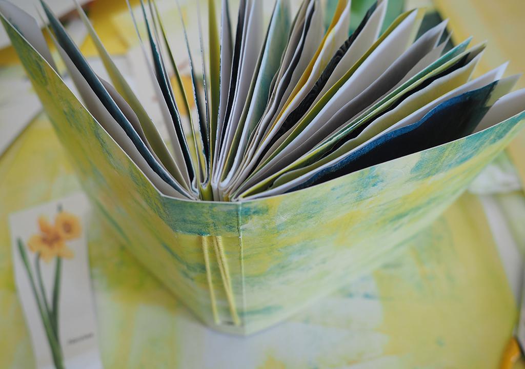 An der Bindetechnik zweifle ich etwas, musste sie aber unbedingt ausprobieren. Ohne Faden und Leim, die Seiten werden nur eingeschnitten und ineinander gesteckt, schon ein cooles Prinzip. Allerdings funktioniert das wahrscheinlich besser mit größeren Formaten und festem Papier. Meine Seiten sind DinA 5 gefaltet auf Postkartengröße und teilweise aus sehr einfachem Papier, das riss ein und verknubbelte sehr beim Ineinanderstecken.