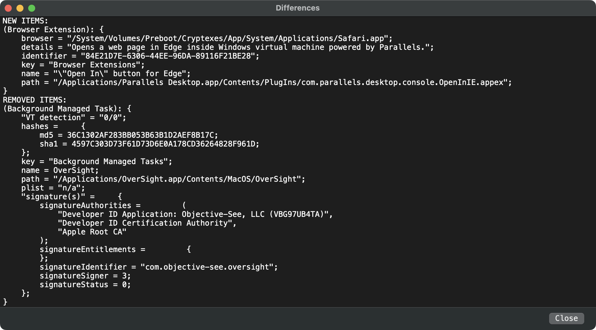 Comparing two scans. Note the addition of (benign) browser extension, and the removal of a (benign) login item.