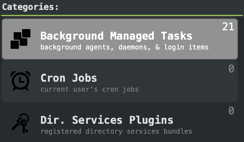The common thread between all these categories is that they could be abused by malware to persist. However, not all have been abused by malware, yet? Moreover, some are deprecated on recent versions of macOS.