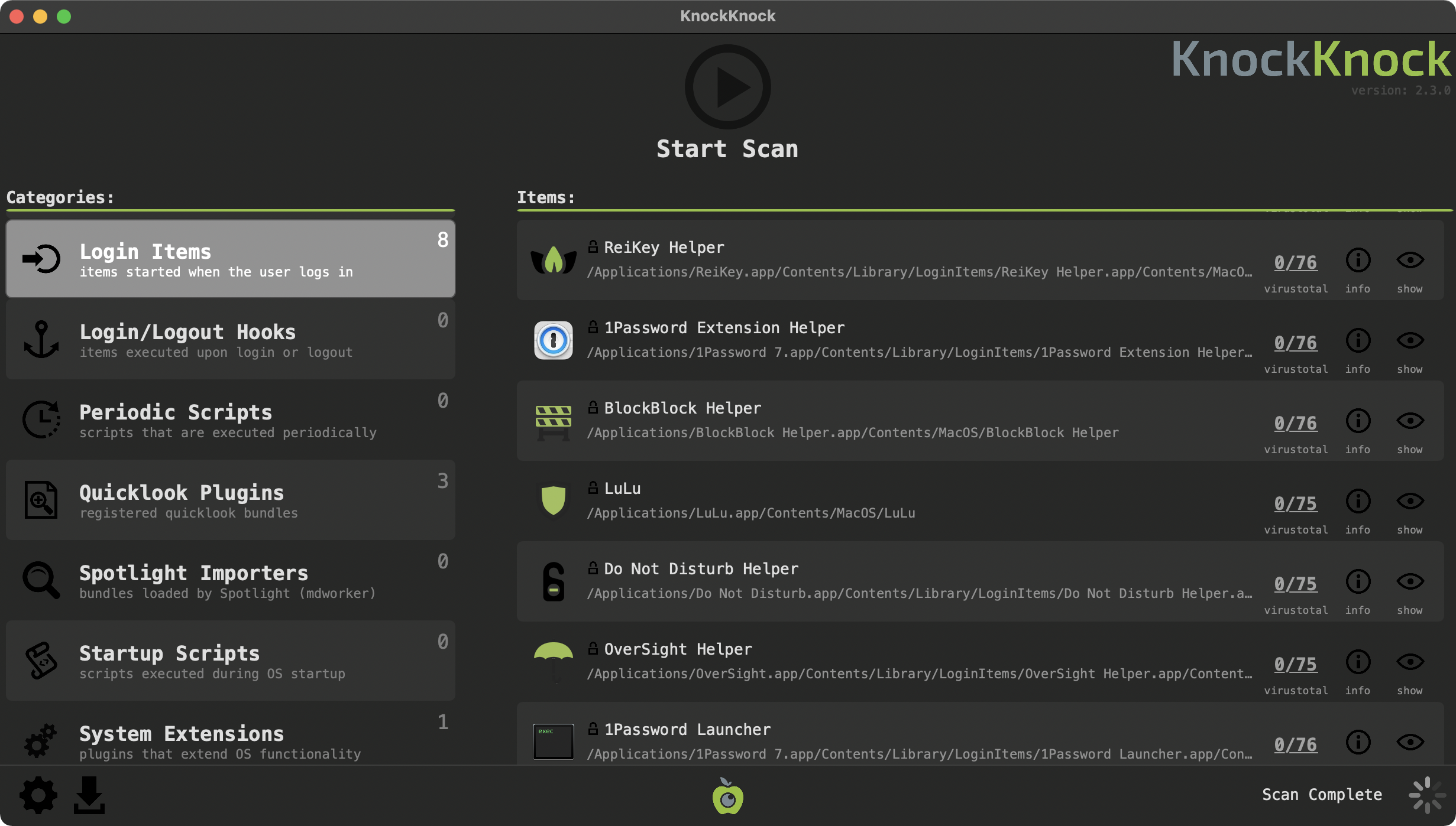 Press the 'Start Scan' button begin a scan. During the scan, KnockKnock will enumerate known locations where persistent software or malware may be installed.