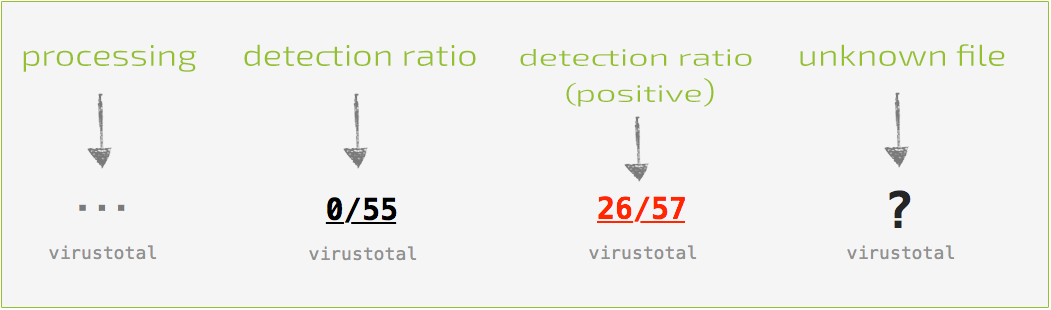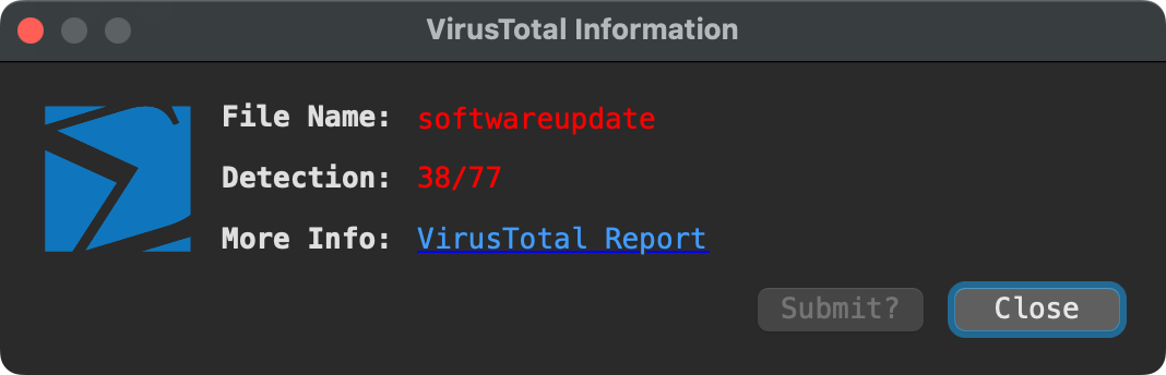 If the item is an executable binary, KnockKnock automatically queries VirusTotal with a hash of the binary in order to retrieve any information. While VirusTotal is being queried, this button displays '■ ■ ■'. Once the query is complete, the title of the button is automatically updated with either the detection ratio, or a '?' if the binary is not known to VirusTotal.