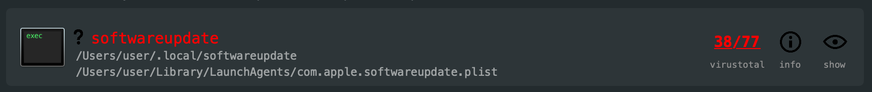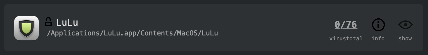 Each row in this table contains the name of the detected item, an icon indicating whether it belongs to Apple , or a 3rd-party (but still signed) , or is unsigned , its full path, and then various informational and actionable buttons. These buttons provide information about item's VirusTotal (anti-virus) scan results, general information about the file, and the ability to view the item in Finder: