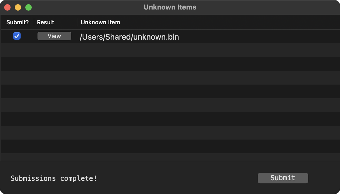 In the list of unrecognized items, select the ones you wish to submit, then click 'Submit' to send them to VirusTotal. Once submitted, a 'View' button will appear in the 'Results' column, allowing you to open the VirusTotal report in your browser.