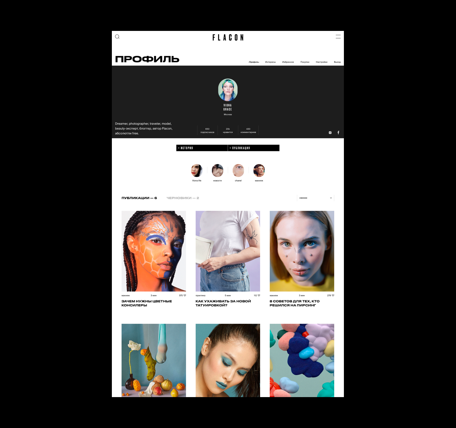 Команда журнала Flacon поставила перед собой амбициозную и важную цель — собрать в одном месте и актуальном формате всех представителей индустрии красоты: журналистов, блогеров, косметические марки и читателей. Мы же помогли создать уникальную digital-платформу, которая с помощью современных инструментов, яркого и честного контента построит живое комьюнити на базе журнала и сократит дистанцию между пользователями и экспертами из бьюти-сферы.