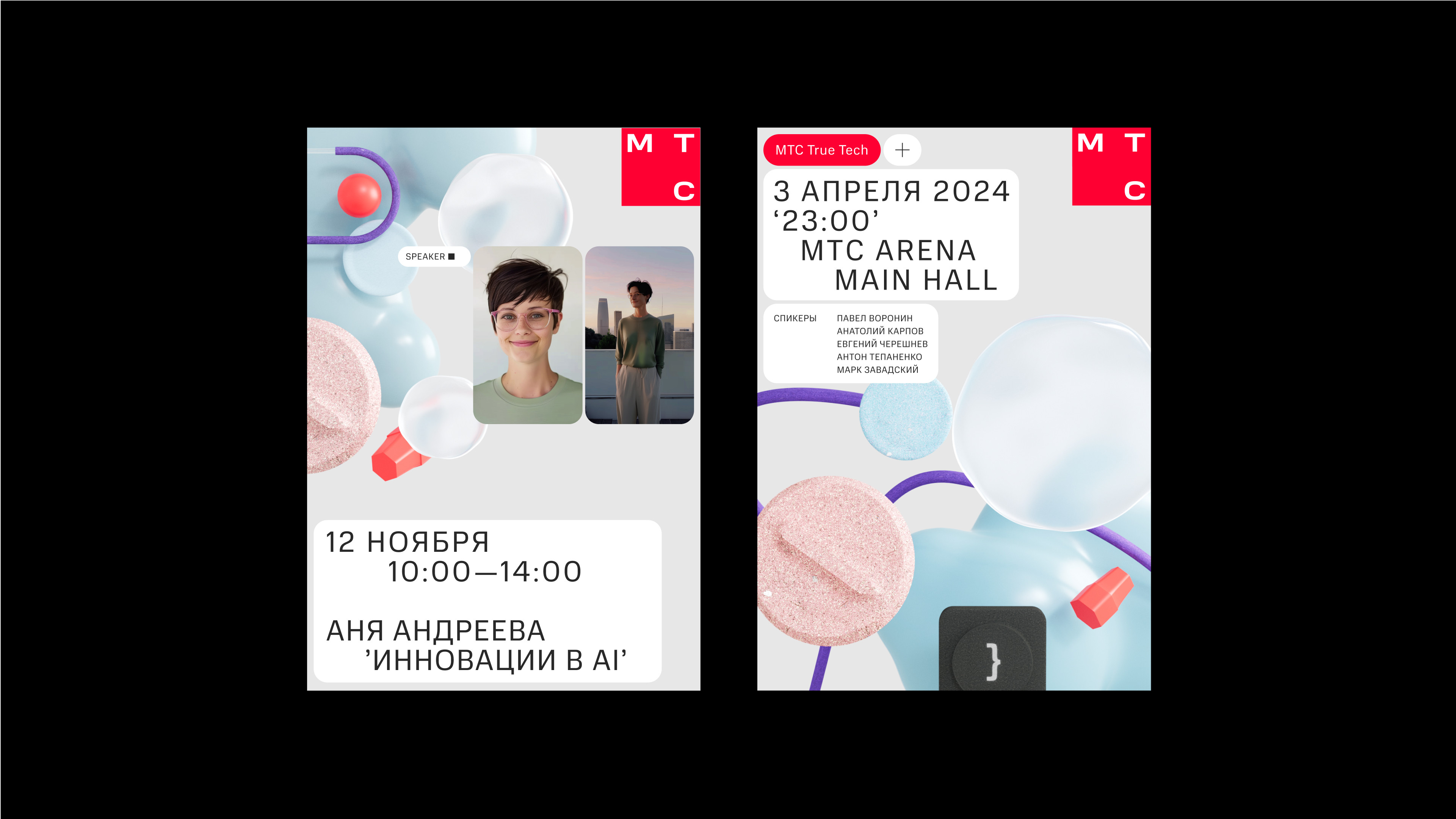 Одно из направлений True Tech, для которого мы разработали отдельный визуальный стиль, — True Tech Day. Это ежегодная масштабная IT-конференция от МТС. Если основной стиль True Tech по цветовой палитре ближе к экосистемному, то стиль конференции смелее отстраивается от него. У True Tech Day появляется собственный фиолетовый цвет и возникают новые цветовые сочетания.