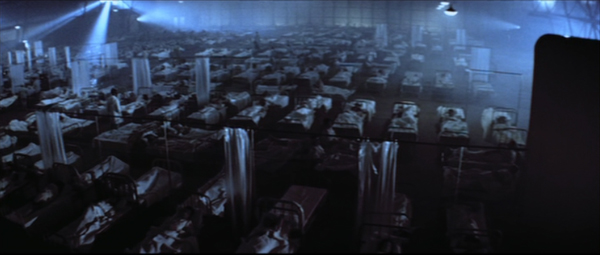 Not dumping out all the backstory at the beginning makes for a better tale. People are asking him “Are you MacLeod?” before we find out that they know him because he was involved with creating the shield, so it’s more of a compelling reveal than when he just blurts it out in narration. (Some street toughs run away when they realize he’s MacLeod, so maybe his reputation is more than scientific.) And there’s an added scene where Brenda (Karin Drexler) on her death bed from radiation sickness makes Connor promise to do something about the sun killing everyone. The camera slowly pulls back showing that she’s surrounded by other beds, like a military hospital. But then it keeps going further and further and no, this is like a giant hangar filled with row after row after row of people dying from the sun. The RAIDERS OF THE LOST ARK warehouse of people dying from the sun.
