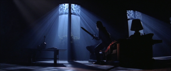 Going from VHS to Blu-Ray is a huge visual leap. The widescreen, the high resolution and the improved FX (though I miss the blazing red skies) make for another great looking Mulcahy movie. The cinematographer this time is Phil Meheux (THE LONG GOOD FRIDAY, Max Headroom, GHOST IN THE MACHINE, GOLDENEYE, MASK OF ZORRO, CASINO ROYALE). Suddenly the battle with those giggling, porcupine-haired assholes from the past seems way cooler. This time I loved the part where they’re fighting on an automated train with wagon-like wheels, and the guy falls off and gets his neck run right over, severing his head. There’s this beautiful shot following the sparks of Quickening electricity from his neck stump to a random can on the street to another piece of metal to a car to another car until it reaches MacLeod. (I learned from the extras that they were animating it to look like a creature and that they were very happy with it and didn’t change it for the new version.)