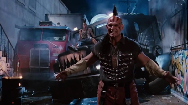 Dacascos and Wolf play Jimmy and Billy Lee, who are introduced losing at a martial arts competition, and then it’s never really about that again. On their way home in The Dragon Wagon (a modified station wagon with jet engine) they fall for a Bugs Bunny style trick where they pull over so Billy can hit on a woman that is actually a man in a wig. That’s when they’re ambushed by a gang of liberty-spike-sporting punks called The Mohawks led by a big dude called Abobo, who I was excited to recognize as Nils Allen Stewart, a prolific stuntment, henchman, and guy who played Jesse Ventura in a cable biopic. This is the same year he played a Mongol guard in THE SHADOW and a bar fight oil worker in ON DEADLY GROUND (plus THE MASK and STICKFIGHTER), so yes, you can tell that he has his trademark bald-except-for-a-braid-on-the-back hairstyle under the wig.