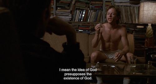 This screengrab reminds me how most of the characters in this movie have big messy shelves crammed with books and records. John has stacks of CDs on the floor (plus a whole bunch of empty wine bottles, but that’s a separate matter). I relate to these piles. Even in the digital age some of us are still like that, for good and/or ill.