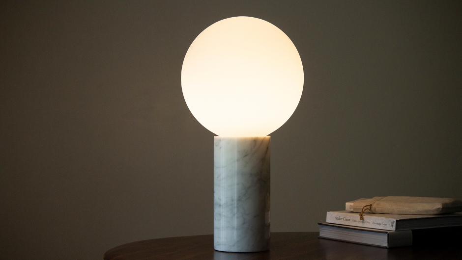 globe that define its iconic silhouette. Pilar is offered in both Carrara white and Marquina black marble bases with a mating 12”(30.5cm)  frosted  Opal glass globe and features an inline full–range dimmer to select any desired light setting and ambiance.