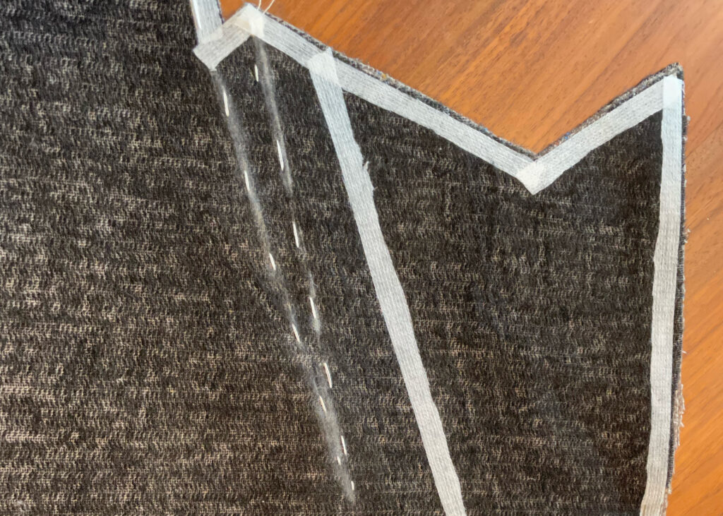Zwischen Futter und Wollstoff kommt eine Lage Wollwatteline. Diese habe ich nur grob zugeschnitten, die Futterteile dort aufgesteckt und zusammengenäht. Dann habe ich die Watteline zugeschnitten und mit dem Futter als ein Teil verarbeitet. Der untere Ärmel und die Säume bleiben ungefüttert (ohne Watteline).