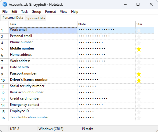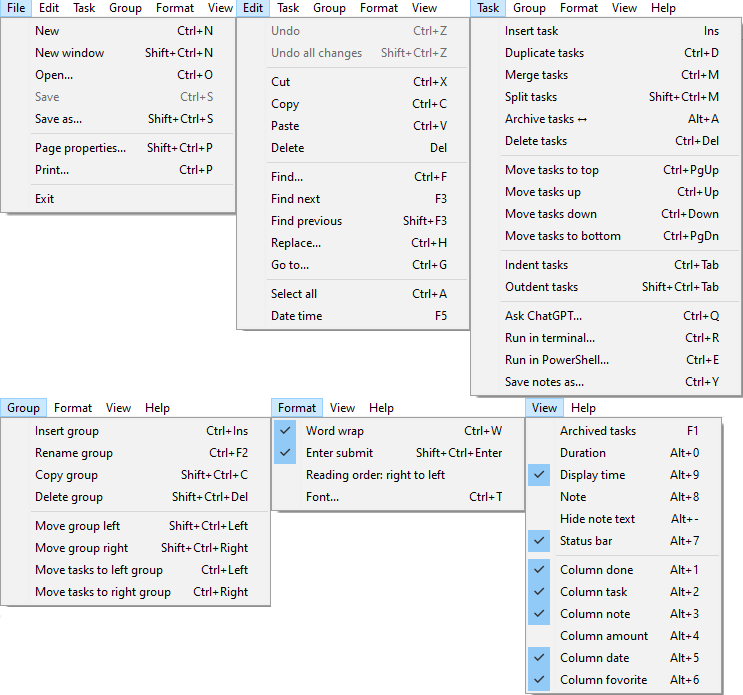 Notetask provides a customizable interface and a range of features to manage tasks effectively, including automatic numbering, paged task groups with duration and amount tracking, task merging, splitting, archiving, indentation, highlighting for overdue or upcoming tasks, copy/paste in Markdown, and an optional encrypted file format. It is fully Unicode-enabled and localized in 14 languages (ar, be, de, en, es, fr, hi, it, ja, ko, pt, ru, uk, zh).