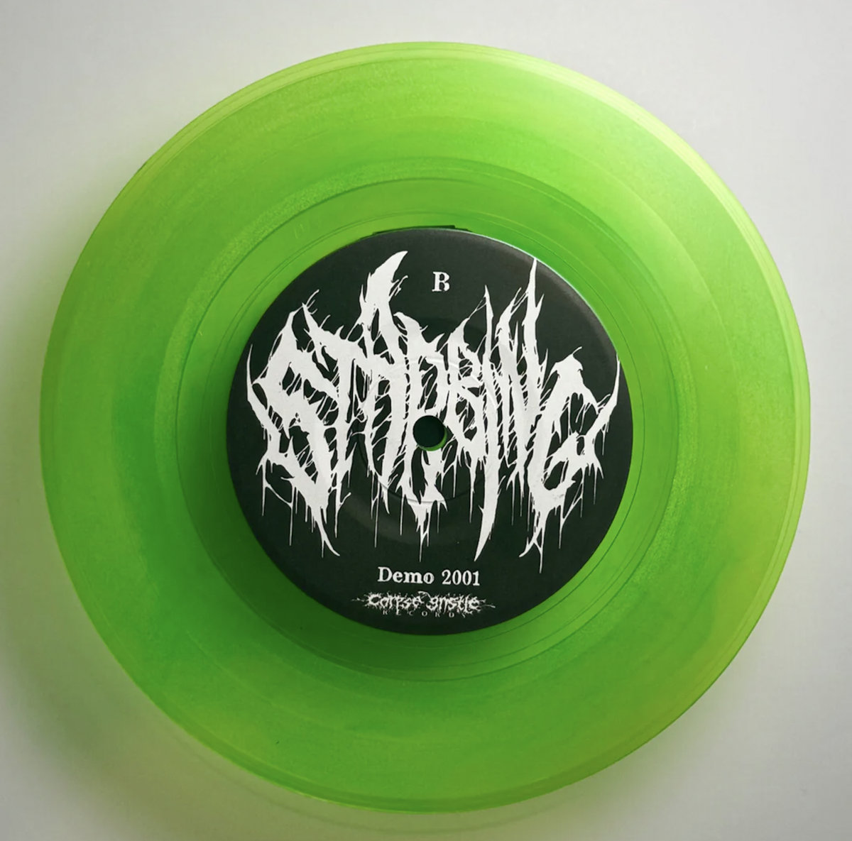 "Stabbing's debut demo from 2021 on 7" vinyl. Limited to 300 total hand-numbered copies (100 black, 100 clear w/bloody swirl, 100 toxic green).